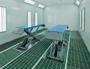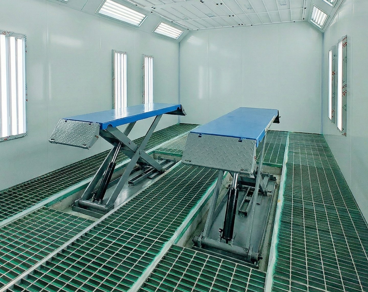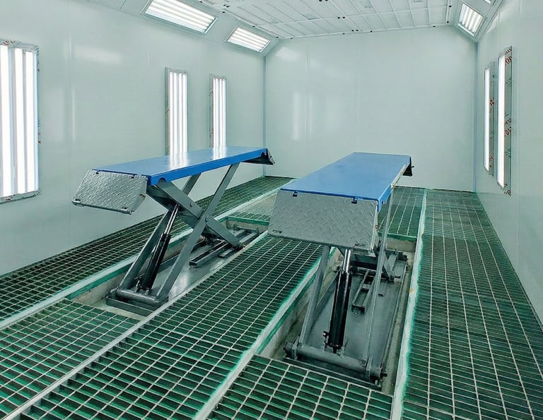 The in-floor scissor lift allows precise vehicle height adjustment, enabling safe and comfortable access to lower body sections, sills, bumpers, and underbody areas. When retracted, the lift sits level with the booth floor, ensuring unobstructed vehicle movement and compatibility with downdraft or side exhaust airflow configurations.